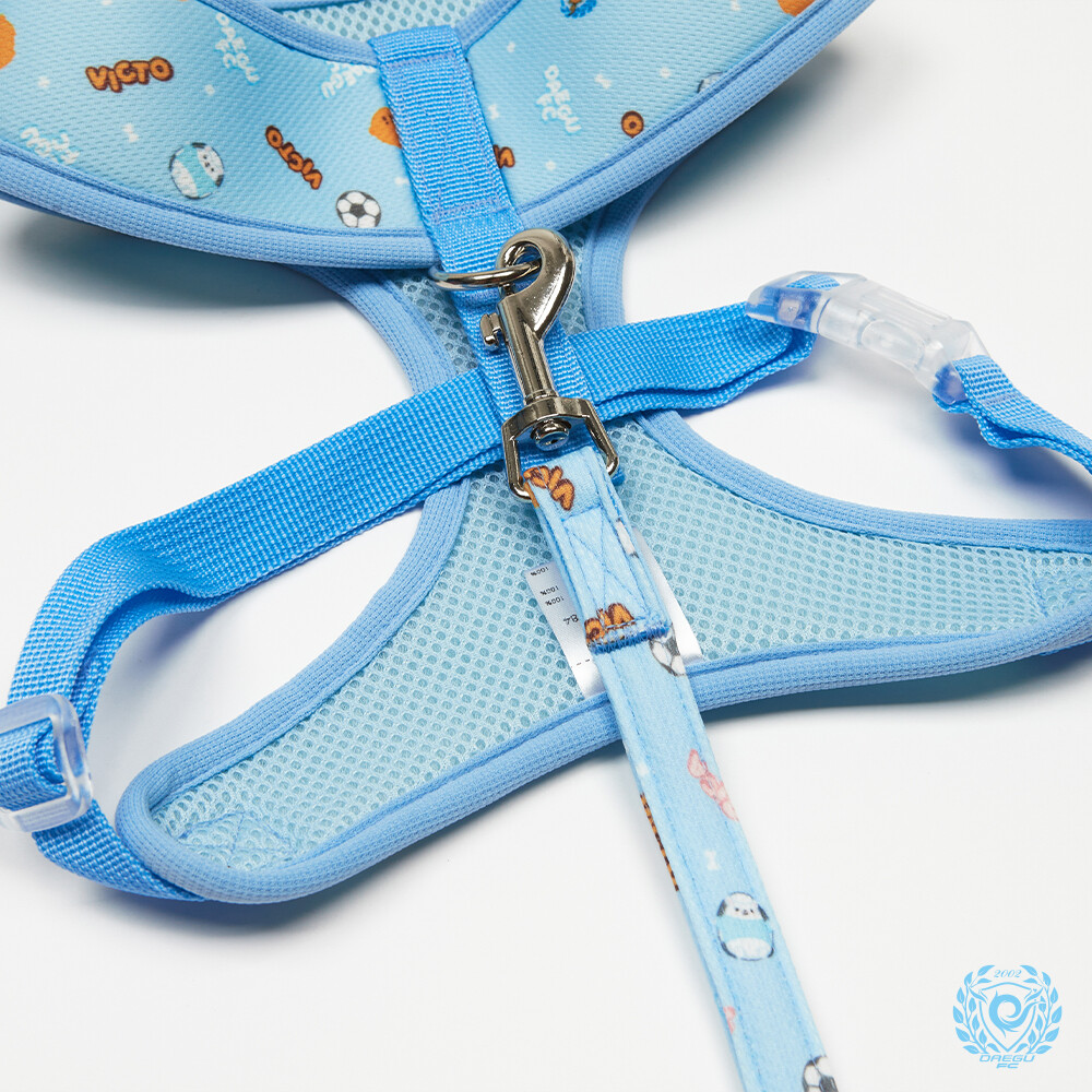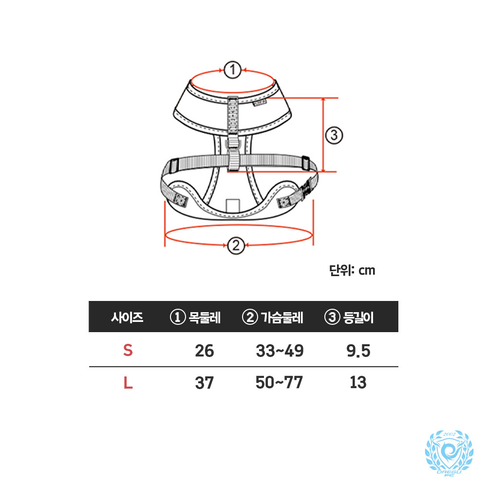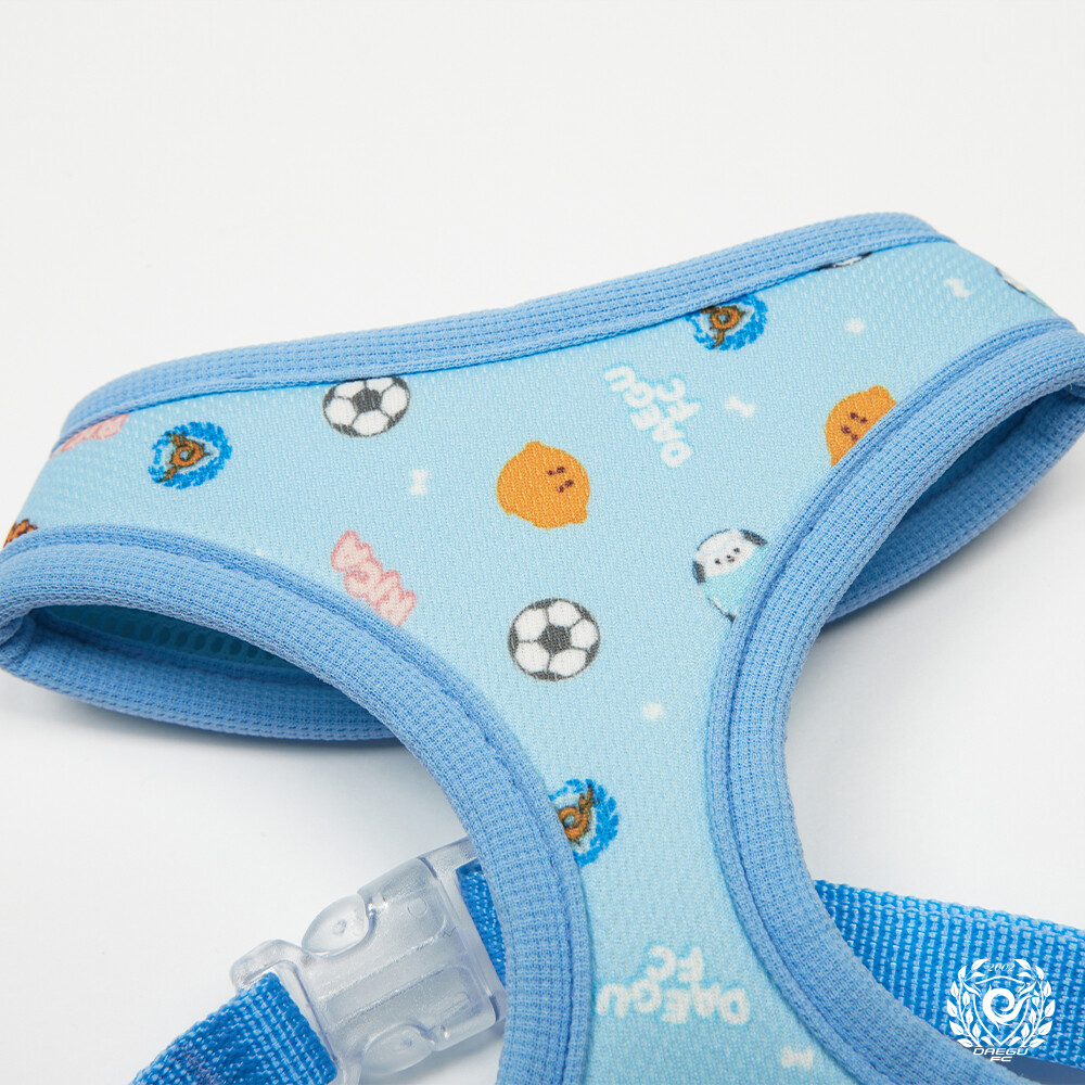 대구FC의 다양한 요소들이 패턴으로 들어간 펫 하네스입니다.